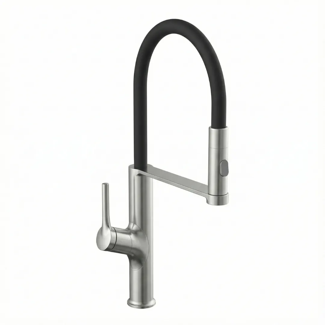 • Semi-Professional Design: Features a flexible, high-arc spout with a colored silicone hose (Black) that mimics the look and functionality of a commercial kitchen faucet.