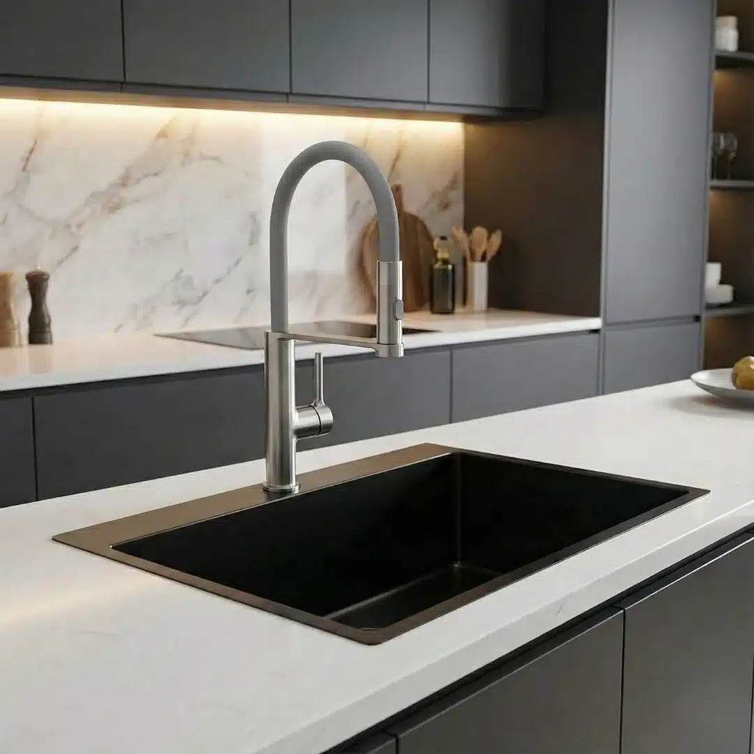 The Carysil Premium Grey Kitchen Faucet Easy Hot & Cold Control is a sleek and modern upgrade for any contemporary kitchen. Its stunning grey finish and elegant gooseneck design make a bold statement, while the integrated touch-sensitive control offers unparalleled convenience and hygiene. With precise control over both hot and cold water, this mixer tap ensures perfect temperature regulation for every use. Crafted from premium materials for long-lasting durability, it’s the ideal choice for elevating both the aesthetic and efficiency of your culinary spac