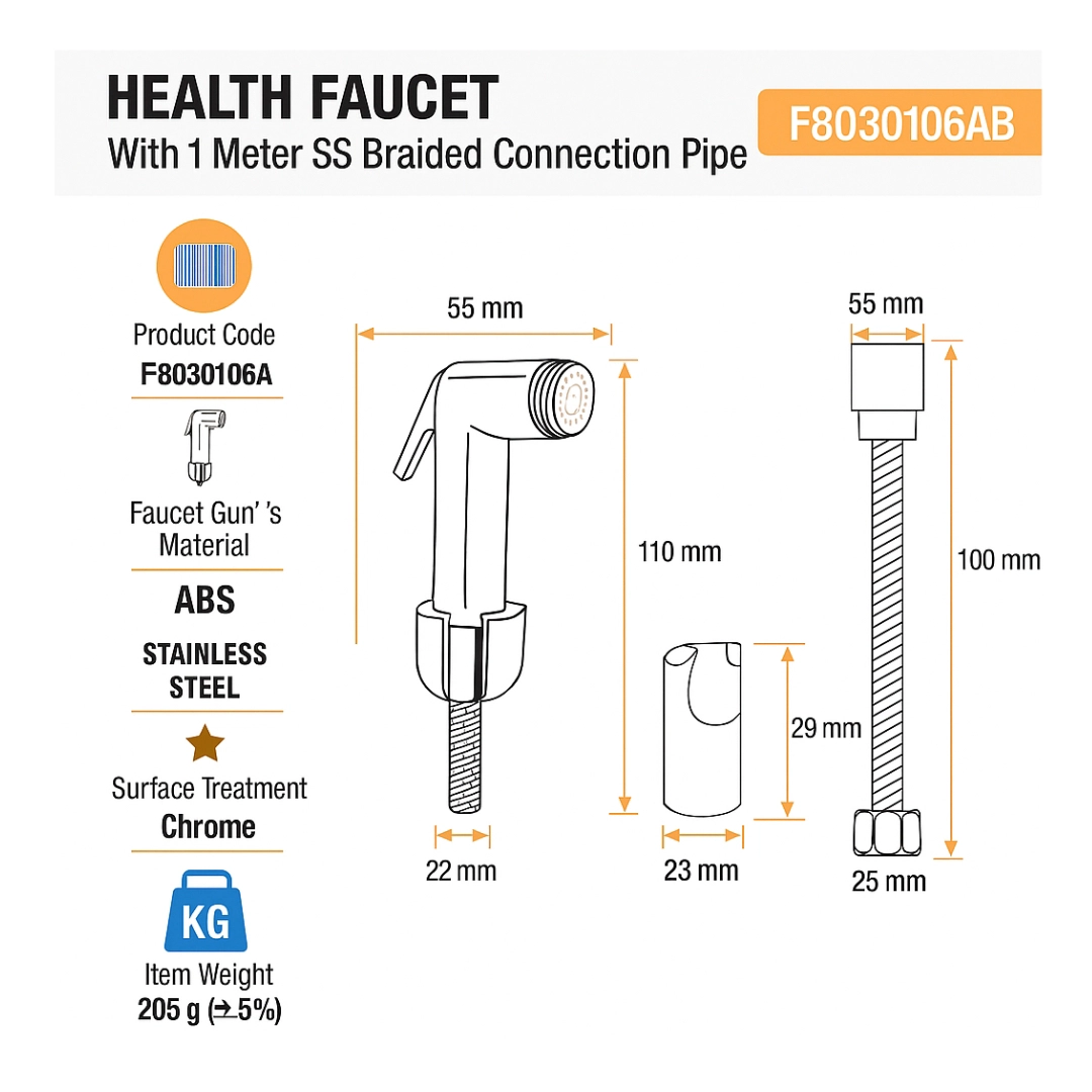 The CERA Health Faucet: Stainless Steel Connection offers a reliable and hygienic upgrade for your contemporary bathroom. The faucet’s ABS (Acrylonitrile Butadiene Styrene) body ensures a lightweight yet remarkably robust construction. A key highlight of the CERA Stainless Steel Faucet F8030106AB is its accompanying 1-meter Stainless Steel (SS) braided connection pipe. Unlike conventional rubber or PVC pipes,