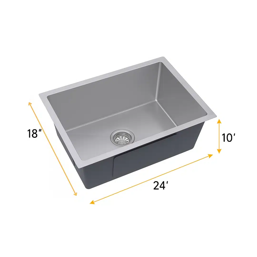 The SYLUX 304 Grade Stainless Kitchen Sink 24x18x10 is a practical and elegant choice for any kitchen. Crafted from high-grade SS304 stainless steel, its timeless satin finish provides exceptional durability and resistance to daily wear, including scratches and corrosion. This single-bowl sink offers generous depth for all your dishwashing needs and comes complete with a sleek round drainer. Its minimalist design effortlessly complements various kitchen styles, making it a reliable and aesthetically pleasing fixture that blends robust performance with understated sophistication for modern homes.