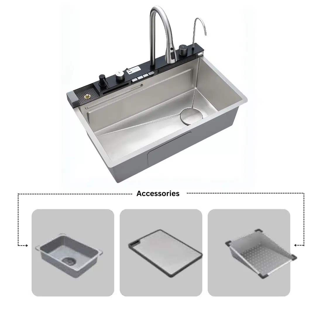 | Accessories Included | Victoria Faucet (Chrome finish) Wooden Cutting Board (Rectangular) Triangle Tray (Steel) Drain Tray (Perforated/slotted design) |