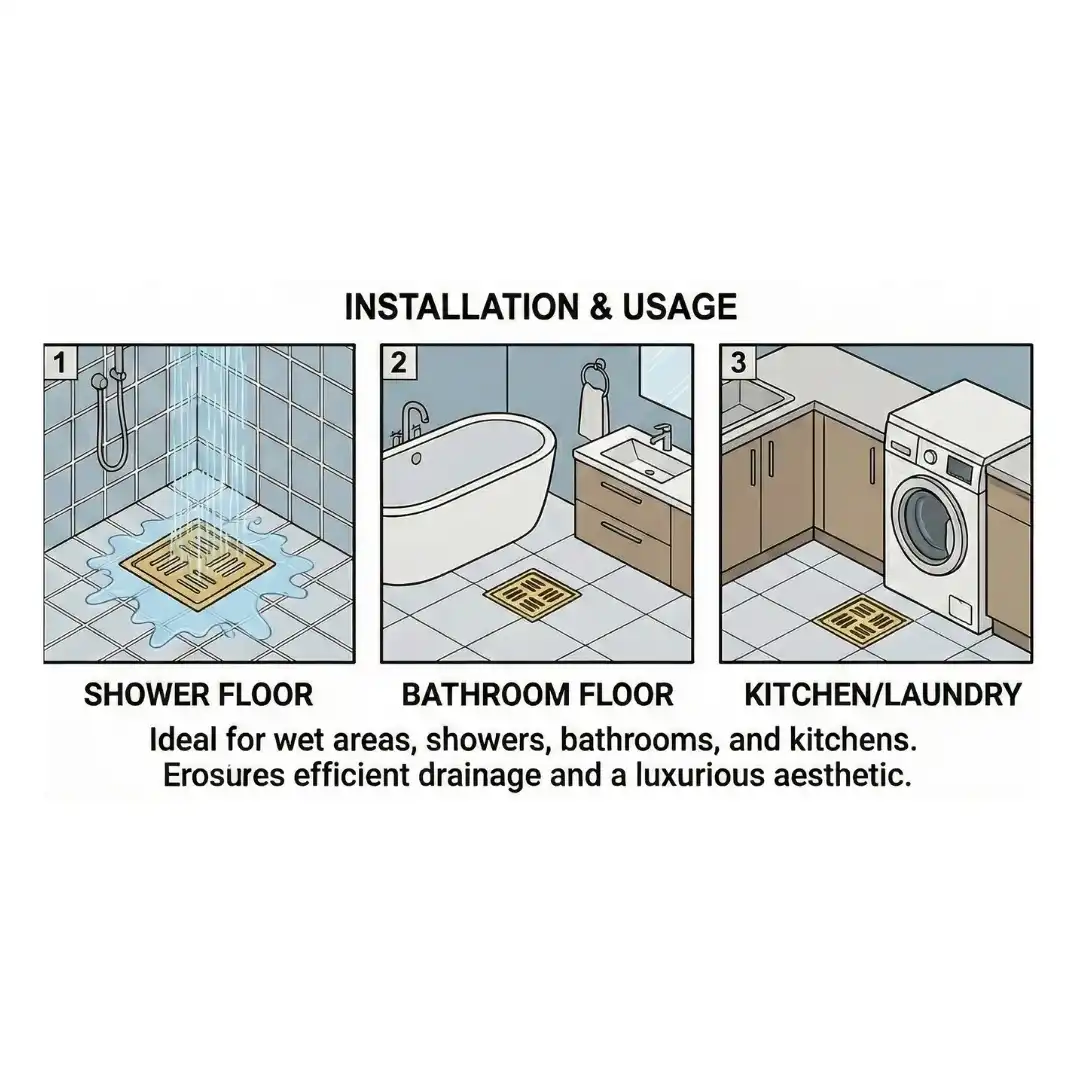 • High-Efficiency Drainage: The precision-cut square hole pattern is designed to maximize water flow (40–65 L/min) and prevent pooling in the shower area.