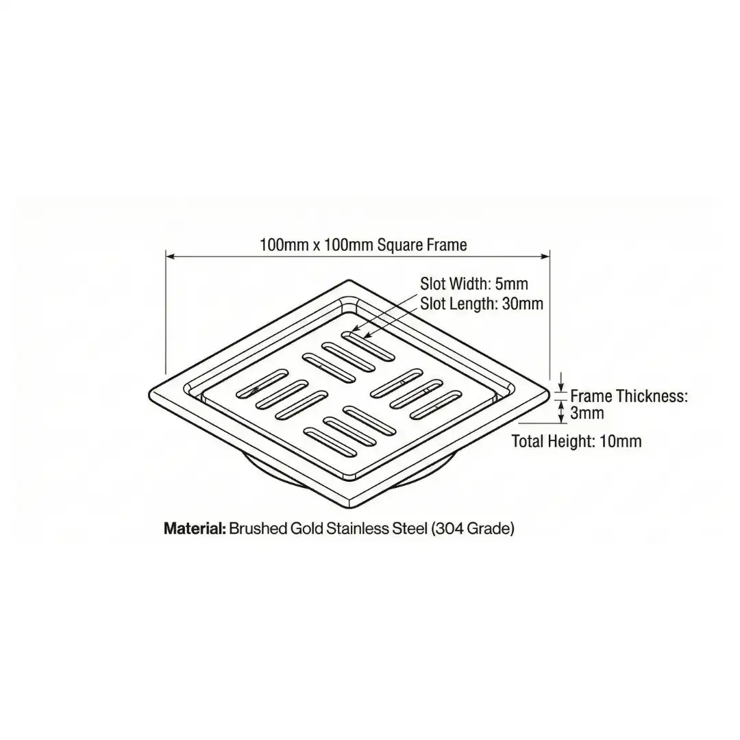 Crafted from durable materials, its advanced design effectively prevents hair and debris from entering the drain, while the luxurious gold finish adds a touch of modern elegance. A perfect blend of functionality and style, this floor grating is an essential upgrade for any contemporary bathroom looking for a stylish and efficient solution.